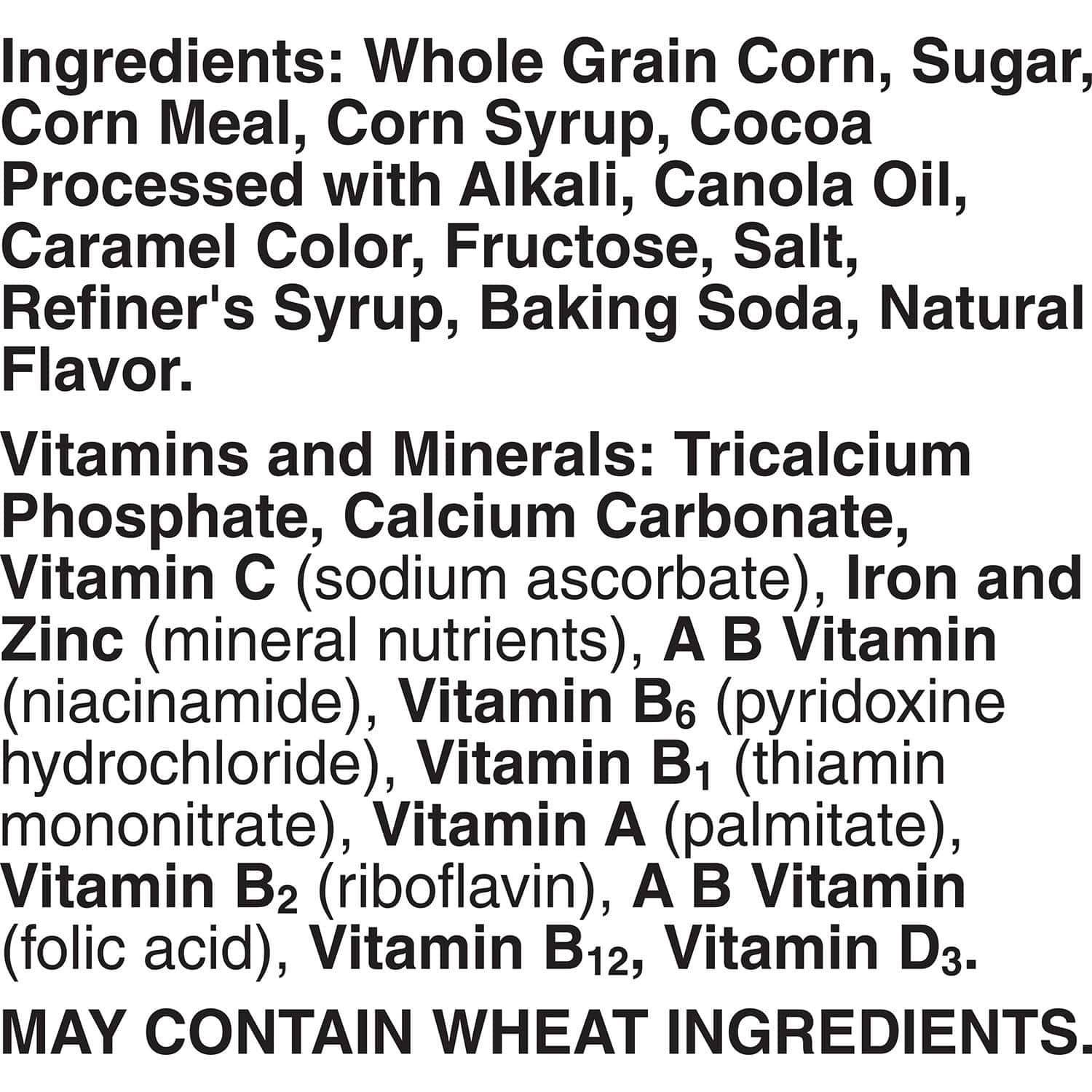 Maíz Integral, Azúcar, Harina de arroz, Jarabe de Maíz ,Cacao Procesado con Alcalí, Aceite de Canola y/o girasol, Sal, Color Caramelo y extracto de achiote, Bicarbonato de Socio, Sabor Natural.