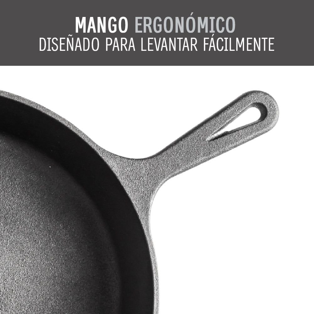 - Hierro fundido de alta calidad. Excelente retención y distribución uniforme del calor, ideal para cocciones precisas.