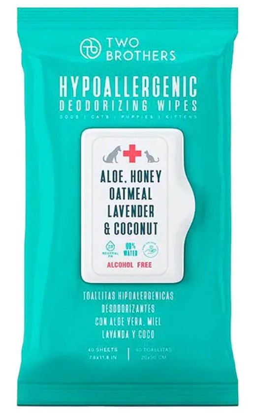 - Las Toallitas Two Brothers Hypoallergenic Wipes están especialmente formuladas para eliminar la suciedad y olores de la piel y pelaje de su mascota.