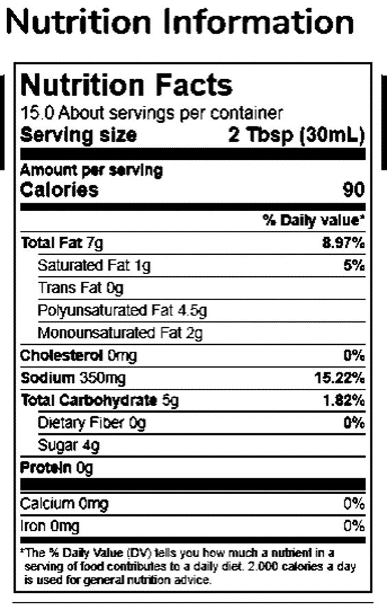 Vinagre destilado, agua, aceite de semilla de soya, azúcar, sal. Contiene 2% o menos de: ajo deshidratado, cebolla deshidratada, pimiento morrón, saborizante natural, goma xantan, especias, extracto de romero, extracto de levadura, extracto de anatto, jugo de limón concentrado.
