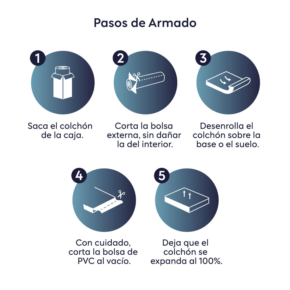 - Colchón en caja empacado al vacío, fácil de transportar y armado sin herramientas.