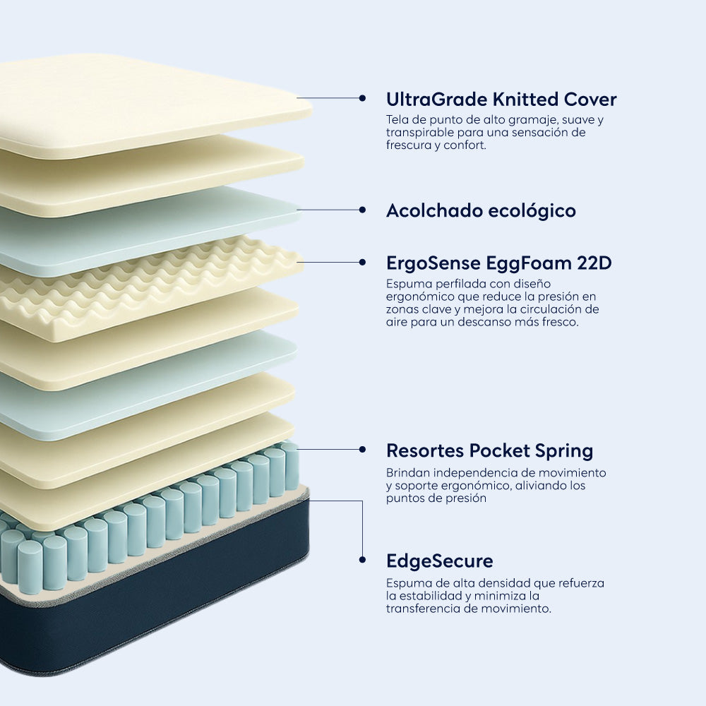 - Resortes Pocket Spring Independientes: Soporte personalizado y reducción de movimiento para mayor estabilidad.