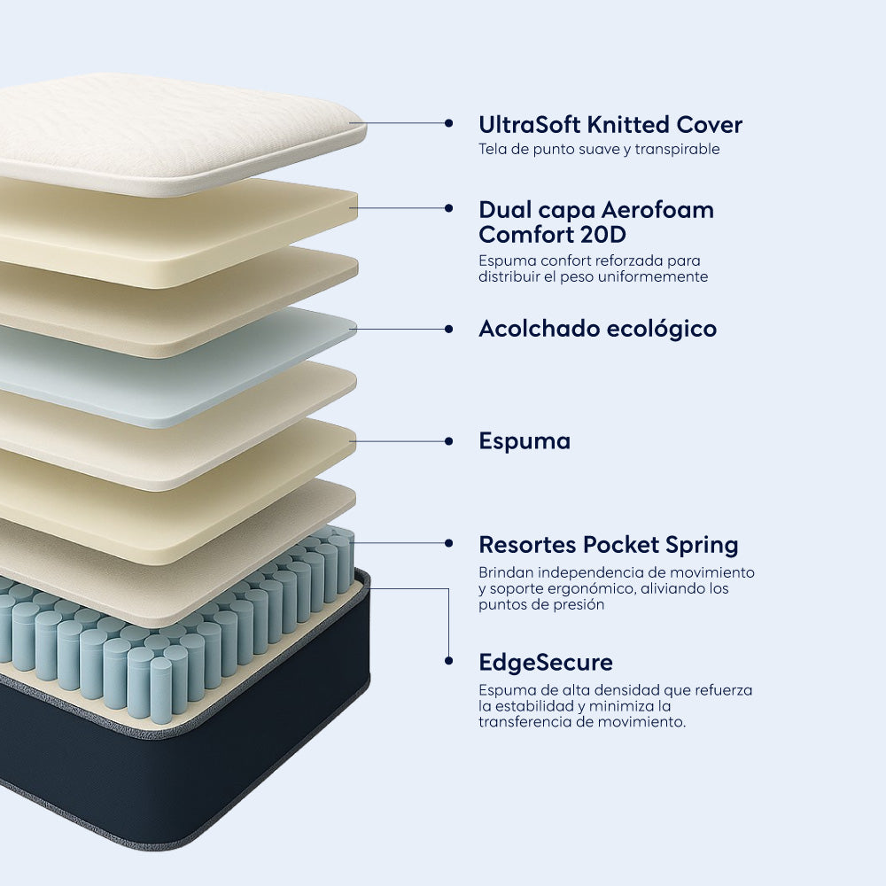 - Tecnología EdgeSecure: Refuerzo de espuma en los bordes para brindar estabilidad y una experiencia de descanso sin límites.
