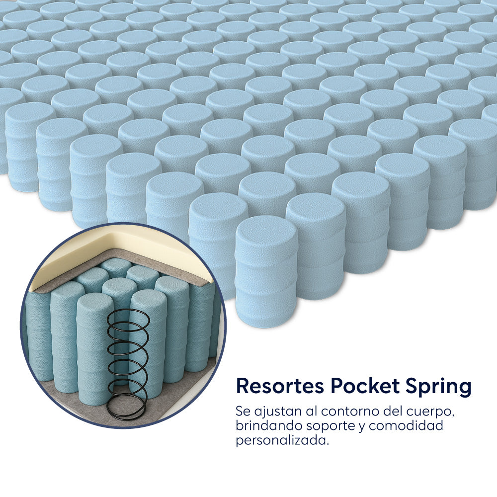 - Resortes Pocket Spring Independientes: Minimiza la transferencia de movimiento y se adapta a los contornos del cuerpo para un soporte personalizado.